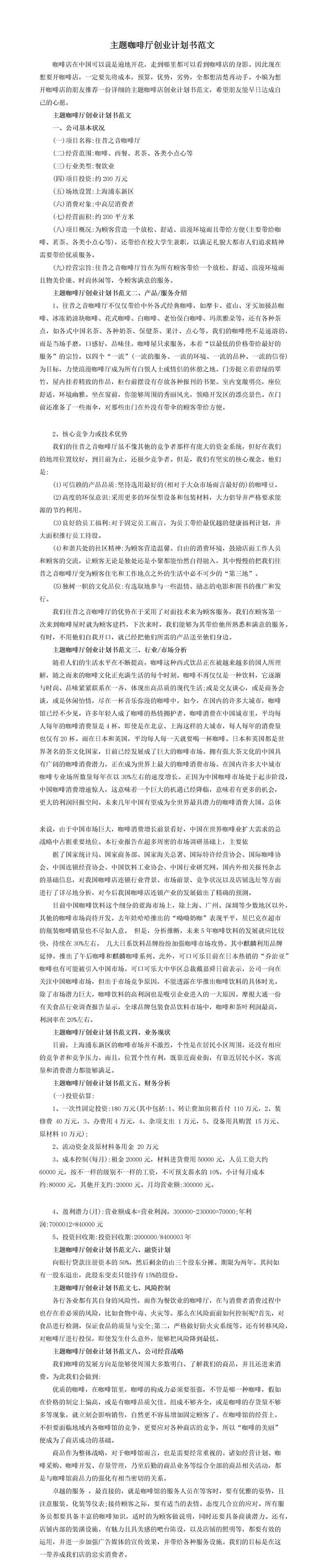 主题咖啡厅创业计划书范文推荐