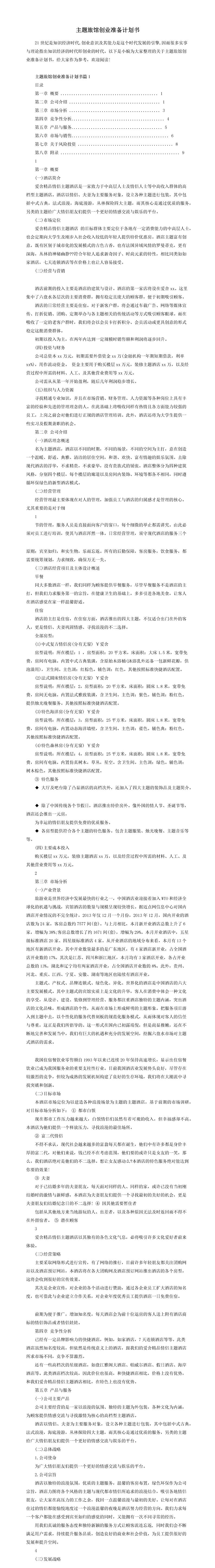 主题旅馆创业准备计划书